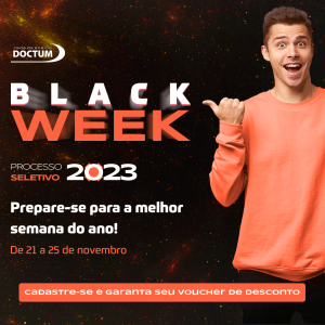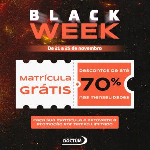 A Black Week da Rede de Ensino Doctum já entrou para o calendário de super promoções no mês de novembro. E neste ano não seria diferente! A campanha acontece durante uma semana, do dia 21 a 25 de novembro, trazendo matrícula grátis e até 70% de desconto na mensalidade.